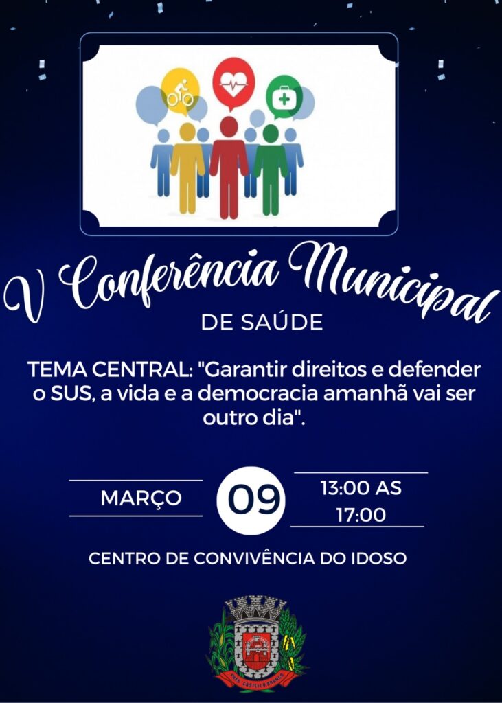 A Secretaria Municipal de Saúde do Município de Presidente Castello Branco, convida a todos para participarem da V Conferência Municipal de Saúde. Será realizada no centro de Convivência dos Idosos com início às 13 horas do dia 9 de março. Sua presença é muito importante!
