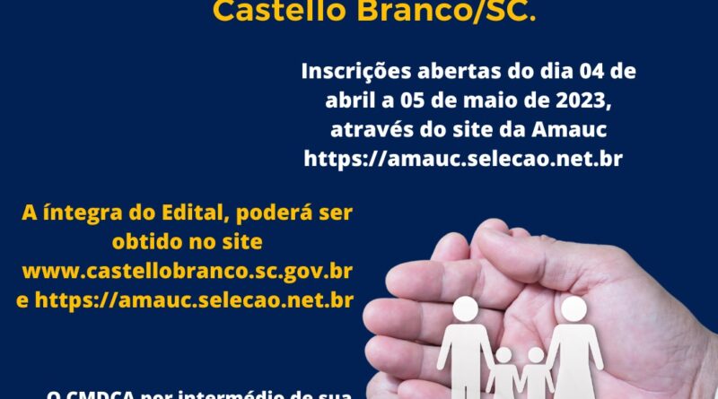 Estão abertas até o dia 05 de maio de 2023(sexta-feira), as inscrições para o Processo de Escolha dos Membros do Conselho Tutelar de Presidente Castello Branco. As inscrições podem ser realizadas através do site da AMAUC. Maiores informações podem estar entrando em contato com Maisa (49) 99956-8798.