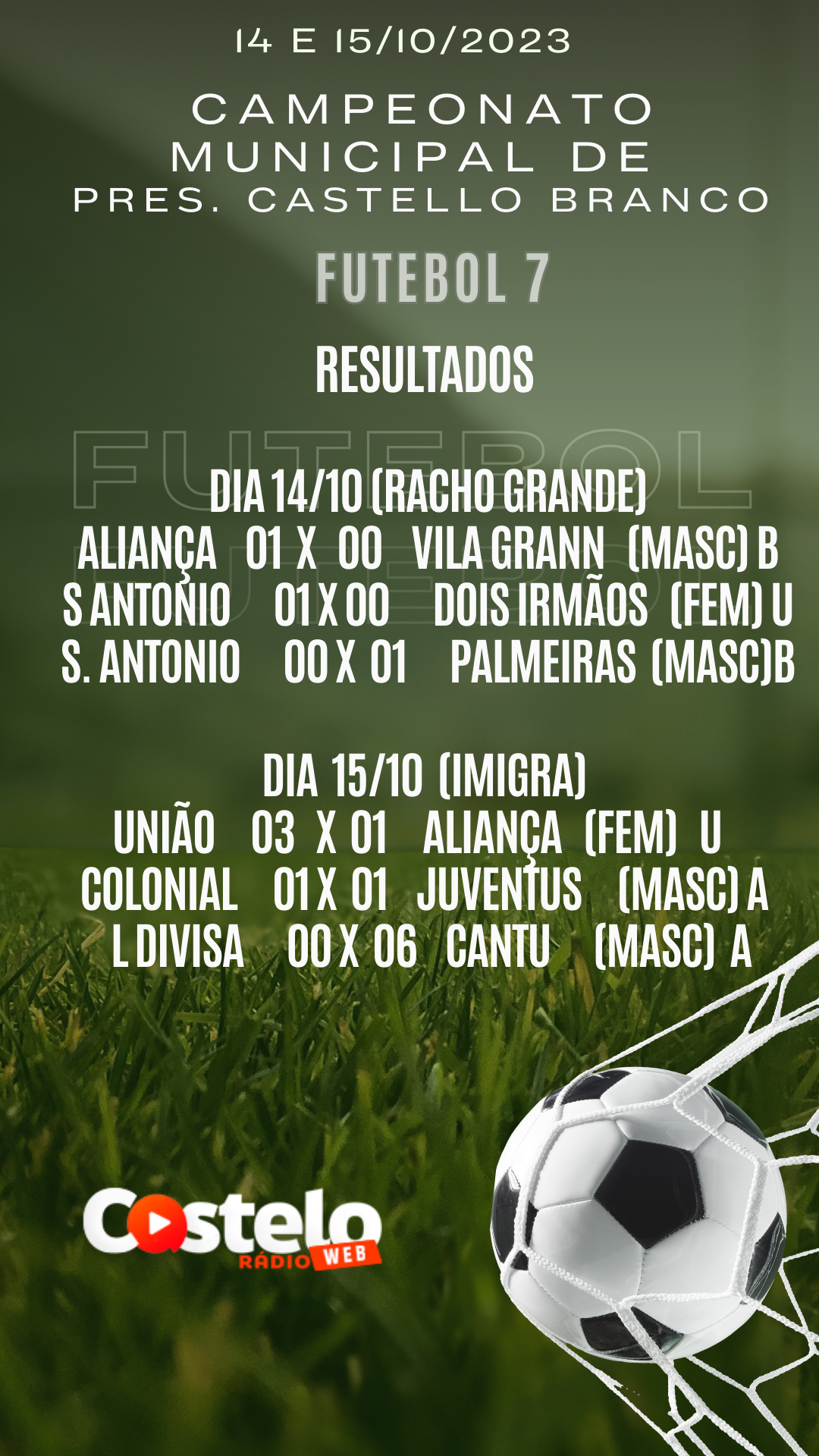 RESULTADOS CAMPEONATO MUNICIPAL FUTEBOL 7 (14 E 15/10/2023)