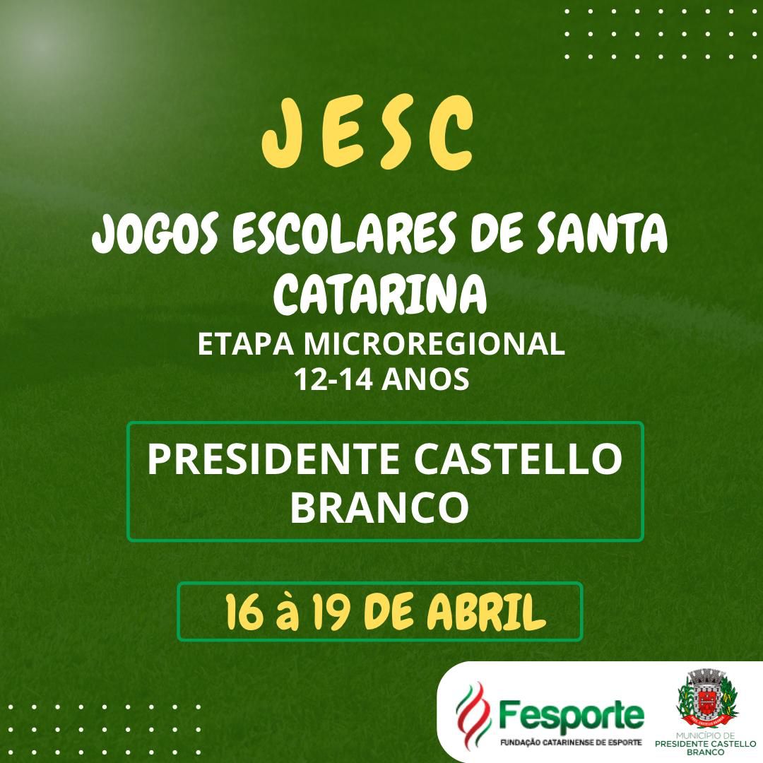 O Departamento de Esportes do Município de Presidente Castello Branco em parceria com a FESPORTE, realizará nos dias 16 à 19 de Abril de 2024, a Etapa Microrregional dos Jogos Escolares de Santa Catarina (JESC) 12-14 anos. Serão disputadas as seguintes modalidades: •Futsal • Badminton • tênis de mesa • xadrez • voleibol • Handebol todas as modalidades nos naipes Masculino e Feminino.