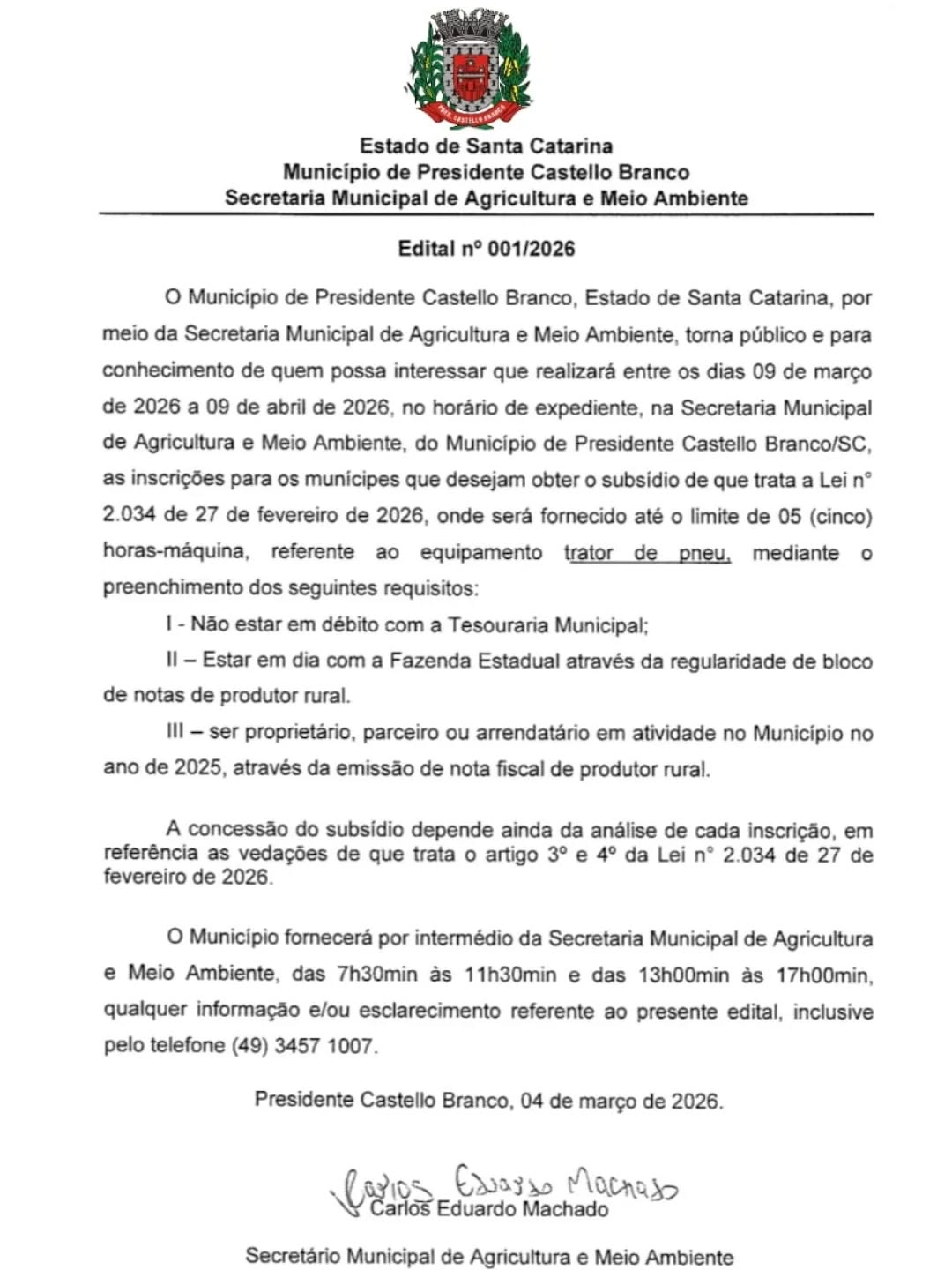 Estão abertas as inscrições para o subsídio conforme a Lei nº 2.034 de 27 de Fevereiro 2026, referente à concessão de horas-máquina para produtores do município.